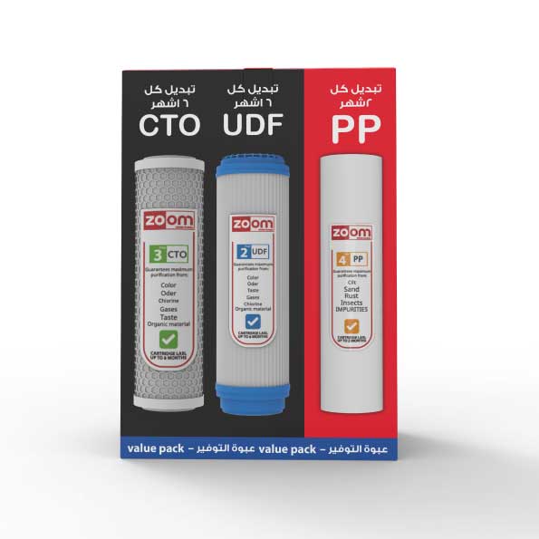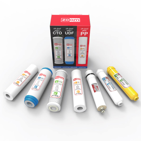 The Zoom High-Quality Filter Cartridge is a complete water filtration solution designed to provide clean and safe water for an entire year. This advanced multi-stage system includes a combination of two first-stage PP cartridges, one second-stage UDF cartridge, one third-stage CTO cartridge, one RO (Reverse Osmosis) filter in the fifth stage, one PC (Post Carbon) filter in the sixth stage, and one Mineral Salts filter in the seventh stage. Each stage targets specific contaminants, ensuring the highest water quality possible.